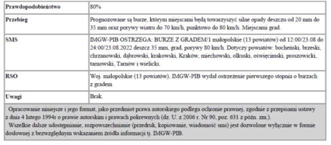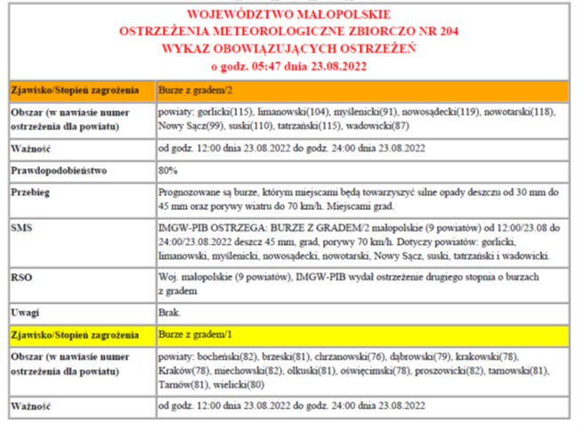 W związku z powyższym proszę podjąć stosowne działania zapobiegawcze i strzegawcze związane z ostrzeżeniem ludności oraz przygotować odpowiednie służby.