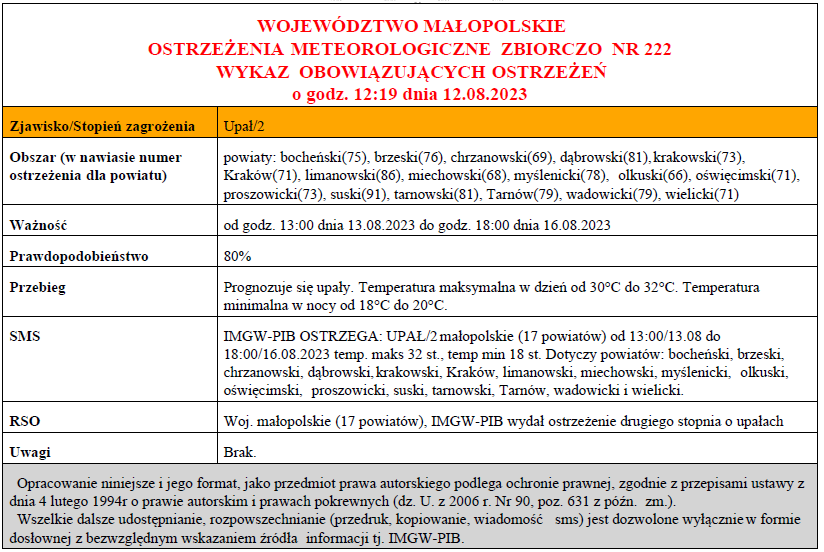 W związku z powyższym proszę podjąć stosowne działania zapobiegawcze i ostrzegawcze związane z ostrzeżeniem ludności oraz przygotować odpowiednie służby.