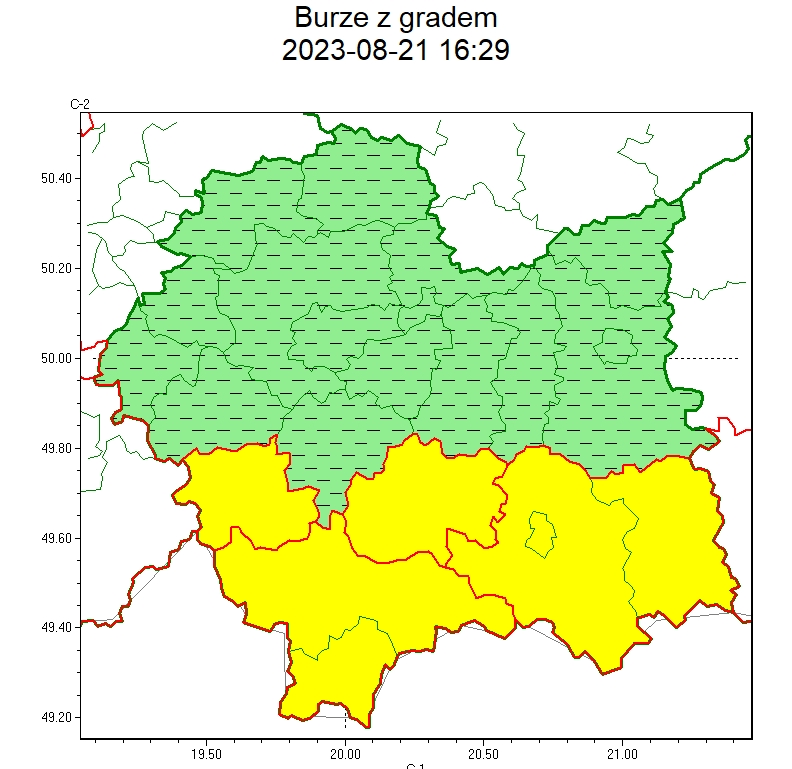 SMS IMGW-PIB INFORMUJE: BURZE Z GRADEM/- małopolskie (15 powiatów) 16:29/21.08.2023 ZJAWISKO NIE WYSTĄPIŁO. Dotyczy powiatów: bocheński, brzeski, chrzanowski, dąbrowski, krakowski, Kraków, miechowski, myślenicki, olkuski, oświęcimski, proszowicki, tarnowski, Tarnów, wadowicki i wielicki.