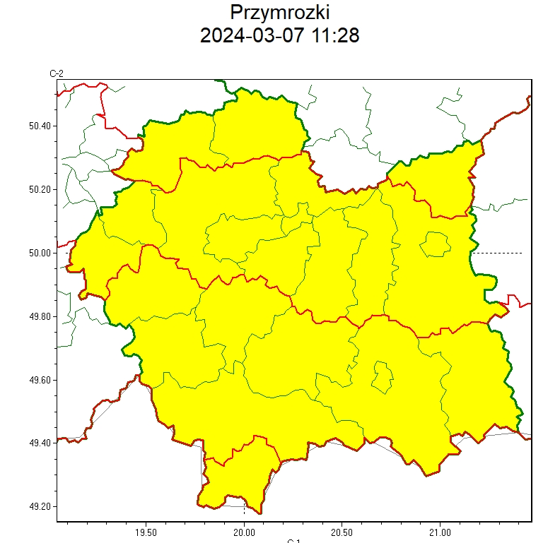 SMS IMGW-PIB OSTRZEGA: PRZYMROZKI/1 małopolskie (8 powiatów) od 00:00/07.03