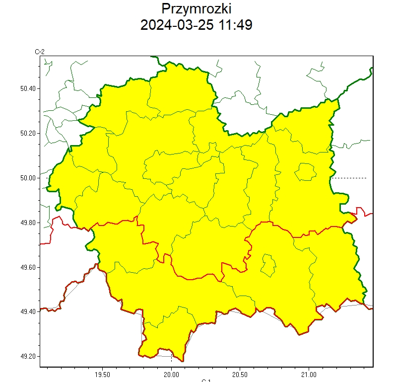 08:00/26.03.2024 temp. min -2 st., lok. -4 st., przy gruncie -6 st. Dotyczy powiatów: bocheński,brzeski, chrzanowski, dąbrowski, krakowski, Kraków, limanowski, miechowski, myślenicki,olkuski, oświęcimski, proszowicki, tarnowski, Tarnów, wadowicki i wielicki.