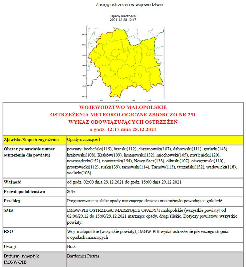 Ostrzeżenie meteorologiczne pierwszego stopnia o marznących opadach 2021-12-28