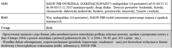 Opracowanie niniejsze i jego format, jako przedmiot prawa autorskiego podlega ochronie prawnej, zgodnie z przepisami ustawy z dnia 4 lutego 1994r o prawie autorskim i prawach pokrewnych (dz. U. z 2006 r. Nr 90, poz. 631 z późn. zm.). Wszelkie dalsze udostępnianie, rozpowszechnianie (przedruk, kopiowanie, wiadomość sms) jest dozwolone wyłącznie w formie dosłownej z bezwzględnym wskazaniem źródła informacji tj. IMGW-PIB. |