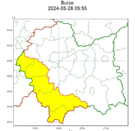 SMS IMGW-PIB OSTRZEGA: BURZE/1 małopolskie (5 powiatów) od 12:00/28.05 do 23:00/28.05.2024 deszcz 25 mm, porywy 75 km/h, grad. Dotyczy powiatów: nowotarski, oświęcimski, suski, tatrzański i wadowicki.