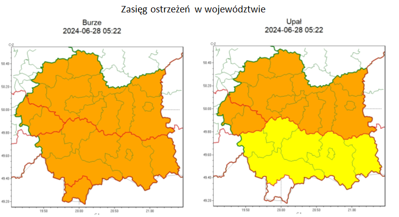 SMS IMGW-PIB OSTRZEGA: UPAŁ/2 małopolskie (2 powiaty) od 12:30/26.06 do18:00/28.06.2024 temp.