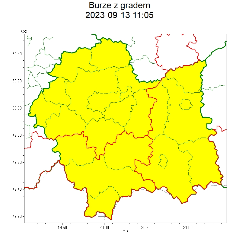 RSO Woj. małopolskie (15 powiatów), IMGW-PIB wydał ostrzeżenie pierwszego stopnia o burzach z gradem