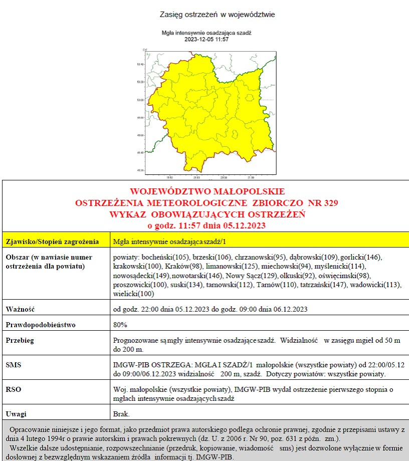 Ostrzeżenie meteorologiczne nr 329 - Mgła intensywnie osadzając szadź /1