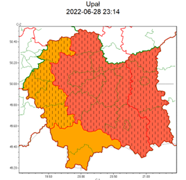 SMS IMGW-PIB OSTRZEGA: UPAŁ/3 małopolskie (11 powiatow) od 23:14/28.06 do
