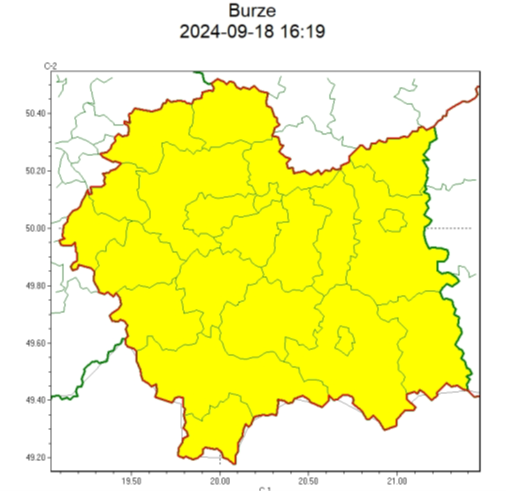 SMS IMGW-PIB OSTRZEGA: BURZE/1 małopolskie (wszystkie powiaty) od 16:25/18.09 do 21:30/18.09.2024 deszcz 25 mm, porywy 70 km/h, grad. Dotyczy powiatów: wszystkie powiaty.